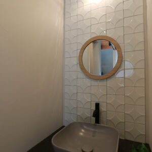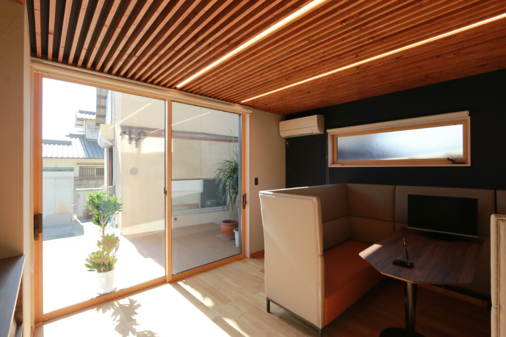 壁には調湿効果をもつ珪藻土、床はナラの無垢材を使用しています。お家のワンポイントにもなる意匠性の高い塗料を使った壁、造作のキッチンカウンターは高い防水性と耐久性の優れたモールテック仕上げ、吹抜けにおしゃれなアイアン手摺りの階段、楽器練習などに使える防音室等を見て頂くことが出来ます。打合せには、75インチのデジタルホワイトボードを使います。見学可能ですので、ご希望の方はご連絡ください。